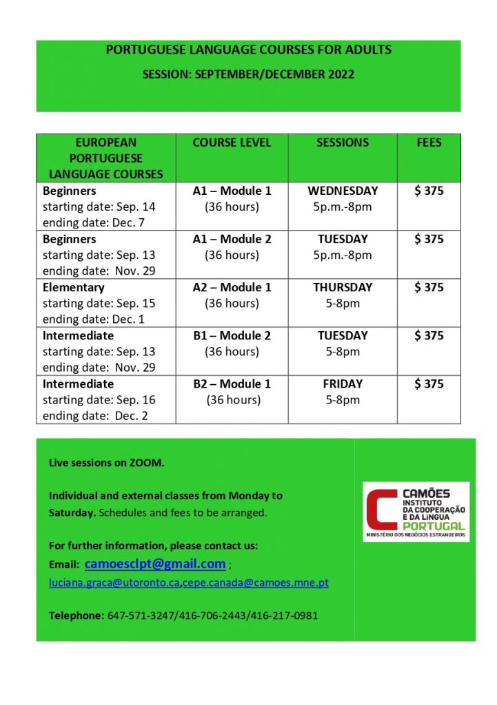 A informação sobre a oferta dos cursos de língua portuguesa no Camoes – Centro de Língua Portuguesa em Toronto já está disponível!